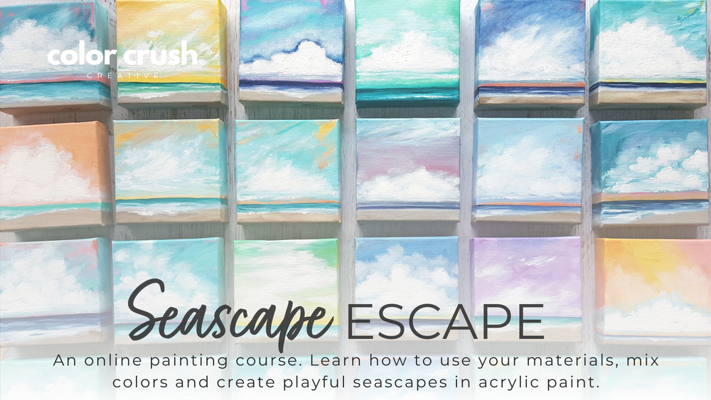 The Seascape Escape acrylic painting course teaches you everything from color mixing and composition to how to paint mini seascapes and scale to larger ones! Build a strong foundation in art while learning to paint something really fun - dreamy beach scenes in vibrant and muted colors. Just imagine your grid of tiny seascapes emerging after painting blissfully in this easy to follow art course!